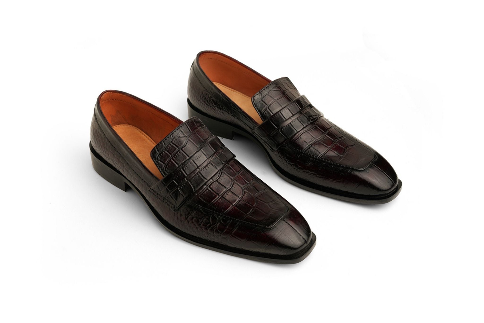 Go to the shopThese dark brown croc-textured penny loafers are made to stand out without trying too hard. The embossed leather adds depth and character, giving a sharp, premium look that works well for formal wear and evening occasions.