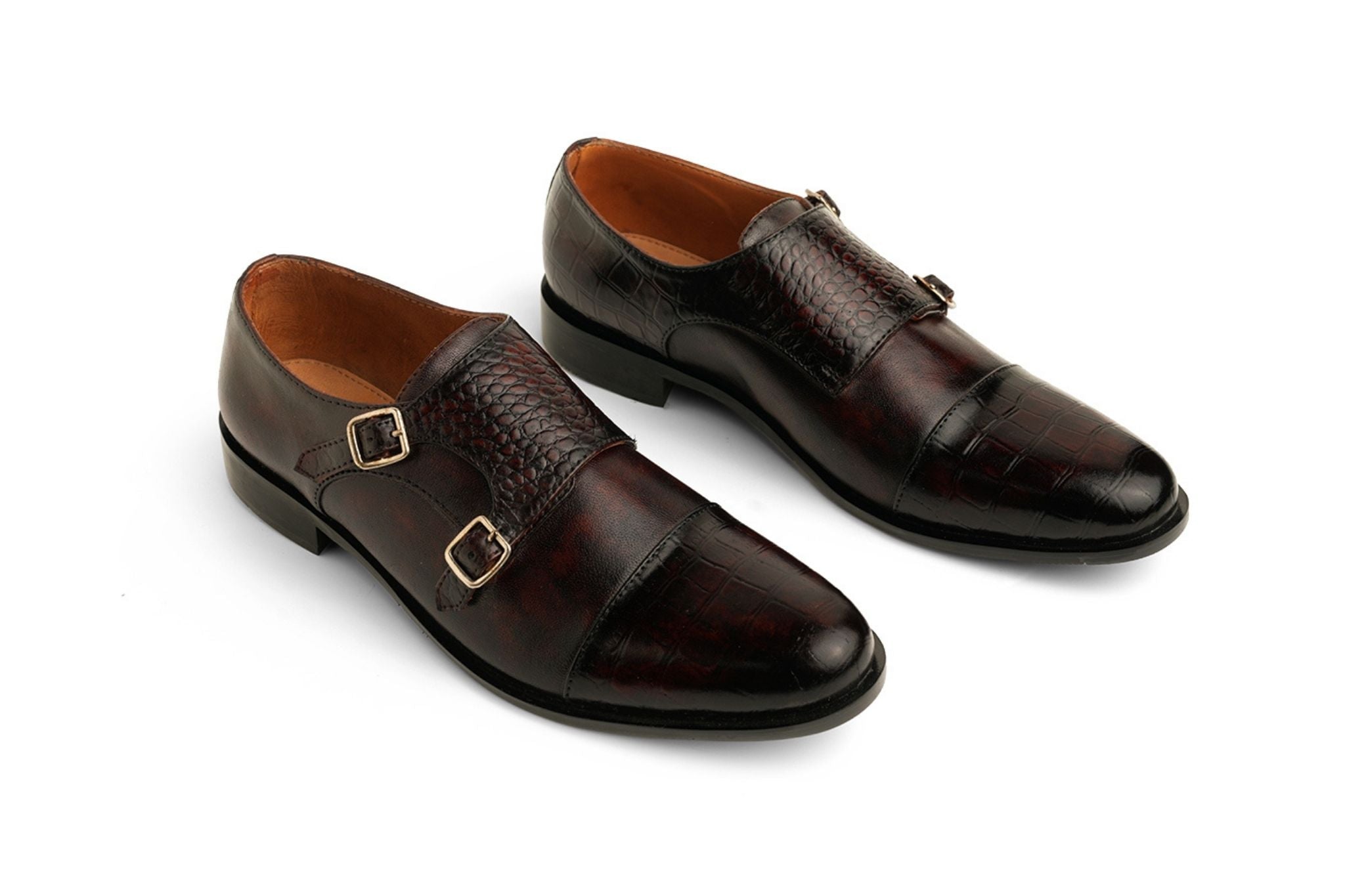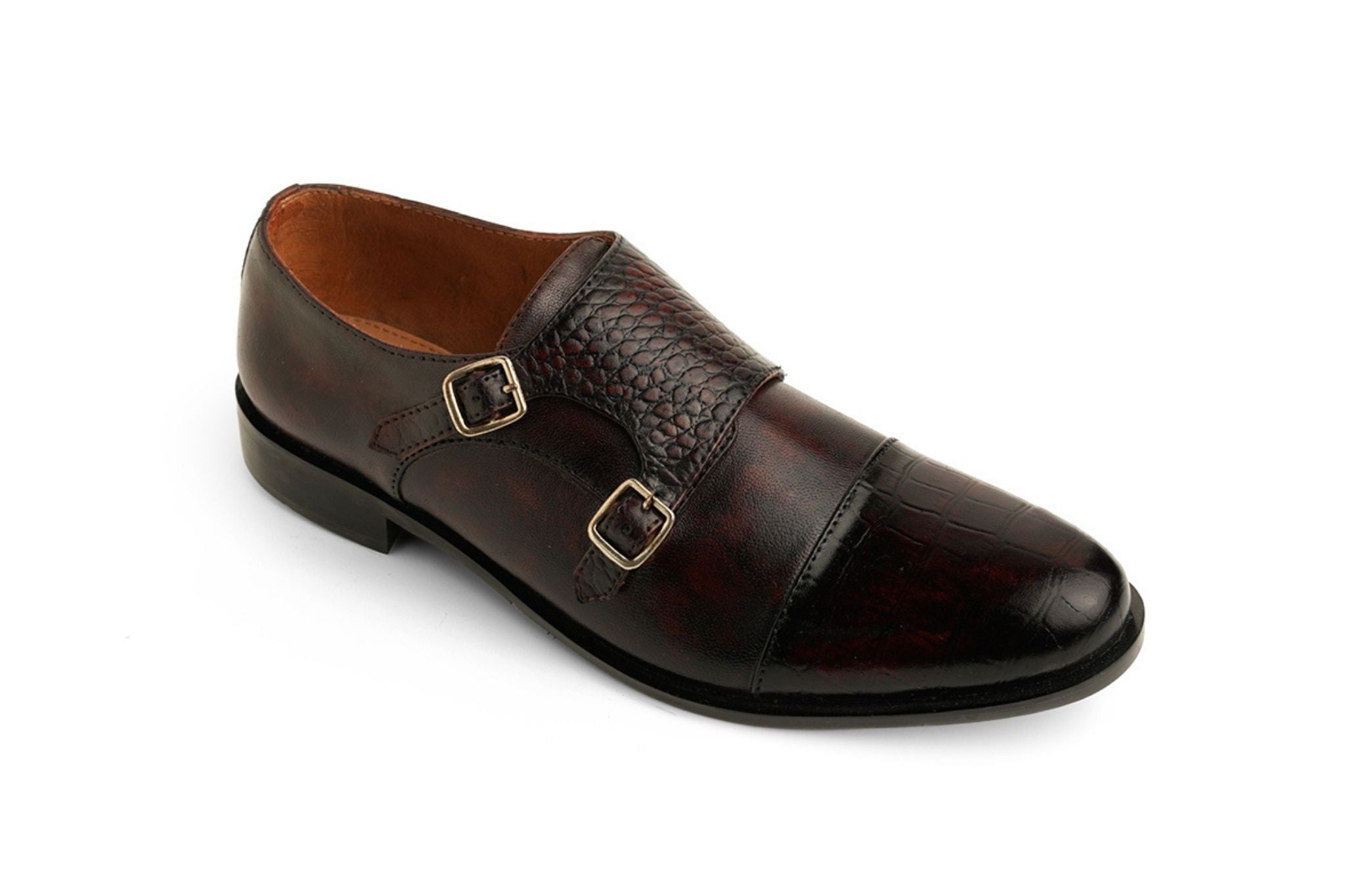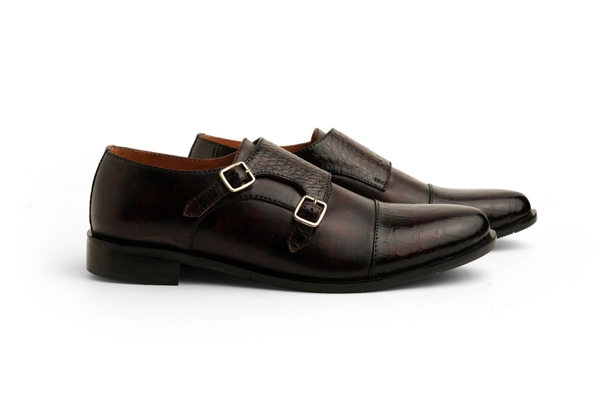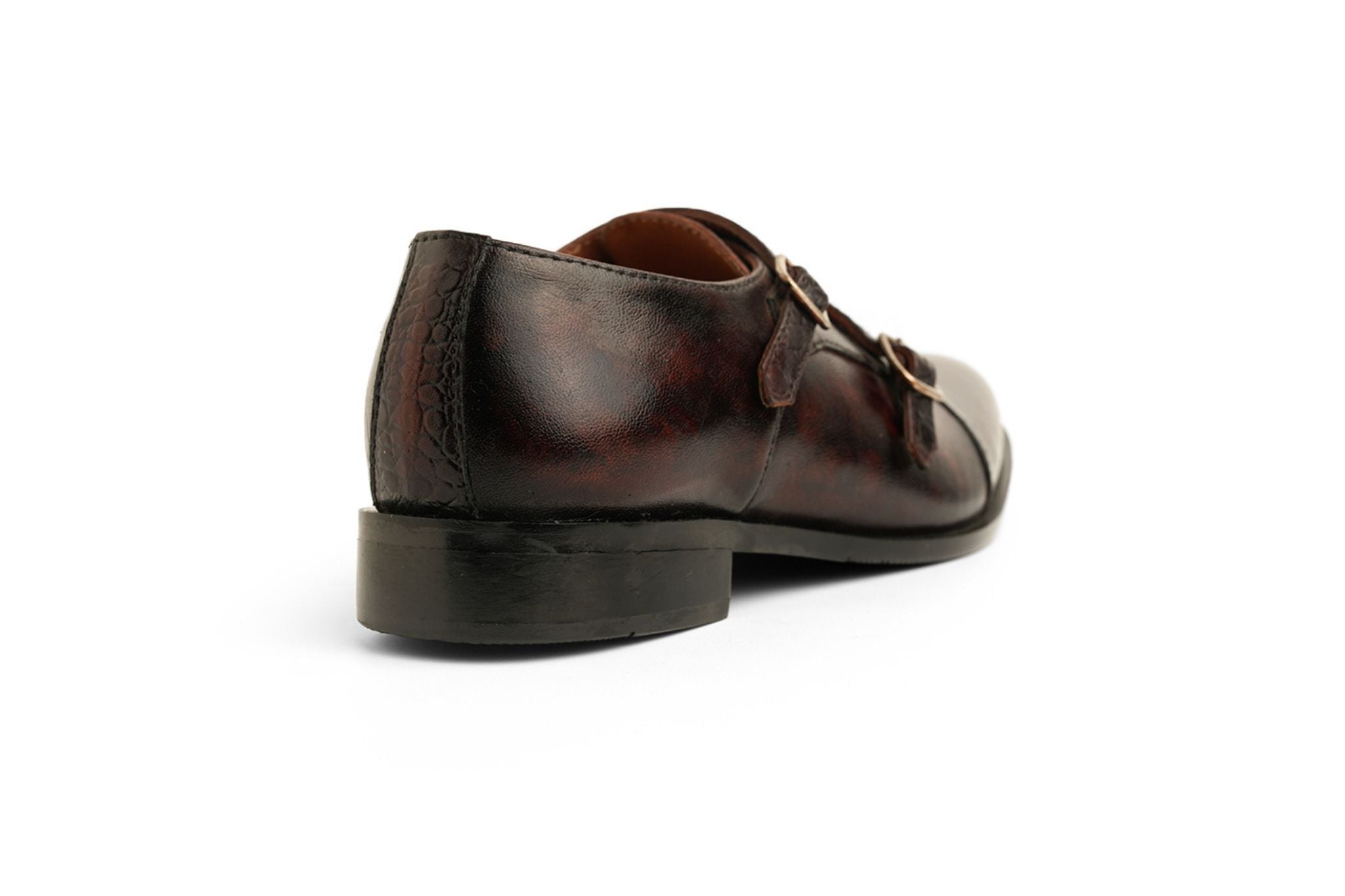 A masterpiece of modern craftsmanship, this double monkstrap showcases marquetry in hand-burnished leather. Croc and pebbled inlays create a striking contrast, lending depth and individuality to its refined design.