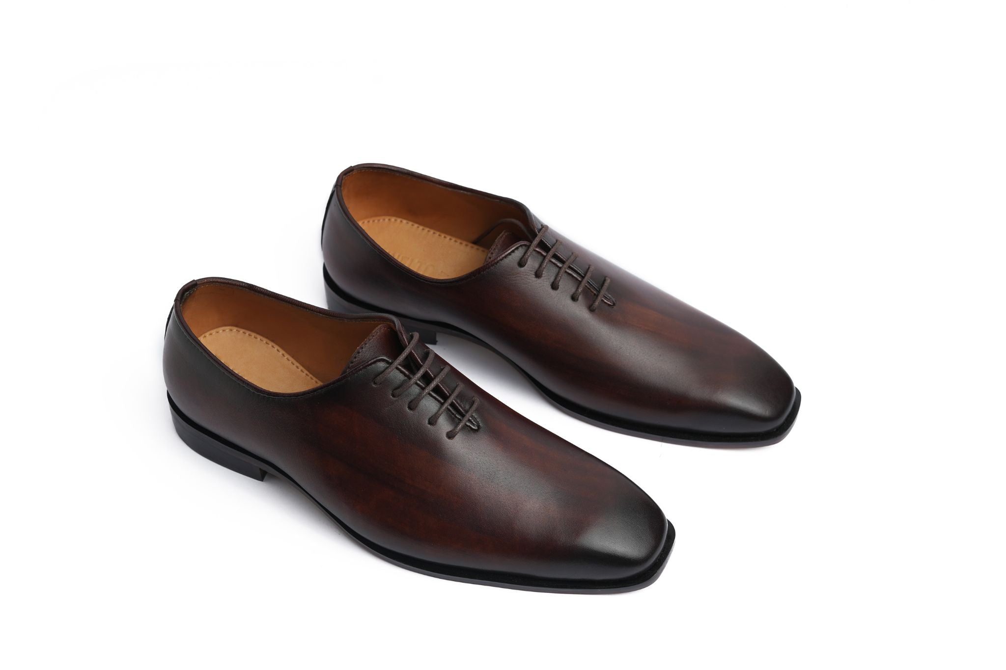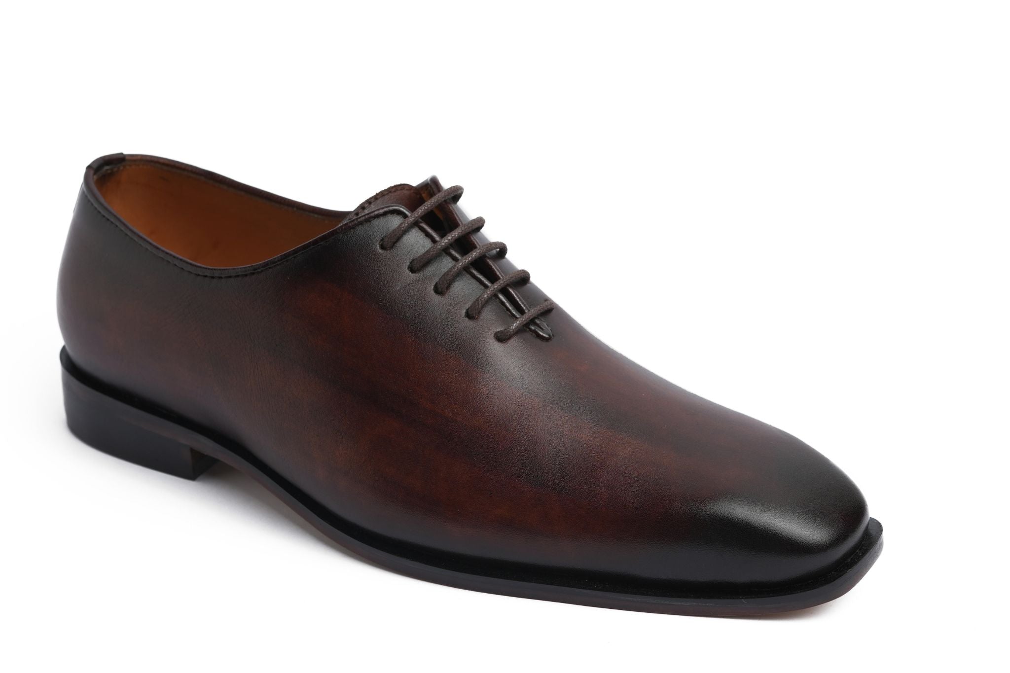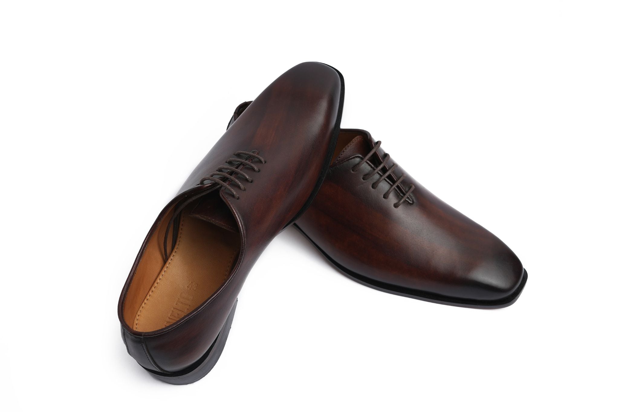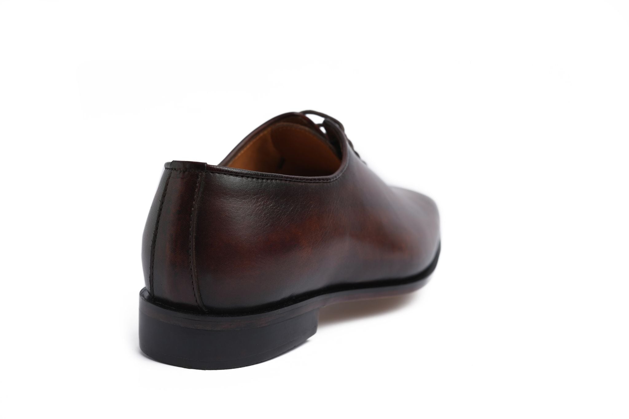 Seamlessly crafted for the discerning gentleman, these Wholecut Oxfords in rich espresso patina exude understated elegance. The burnished wood texture enhances the depth of the sheep leather upper, creating a refined yet contemporary finish.