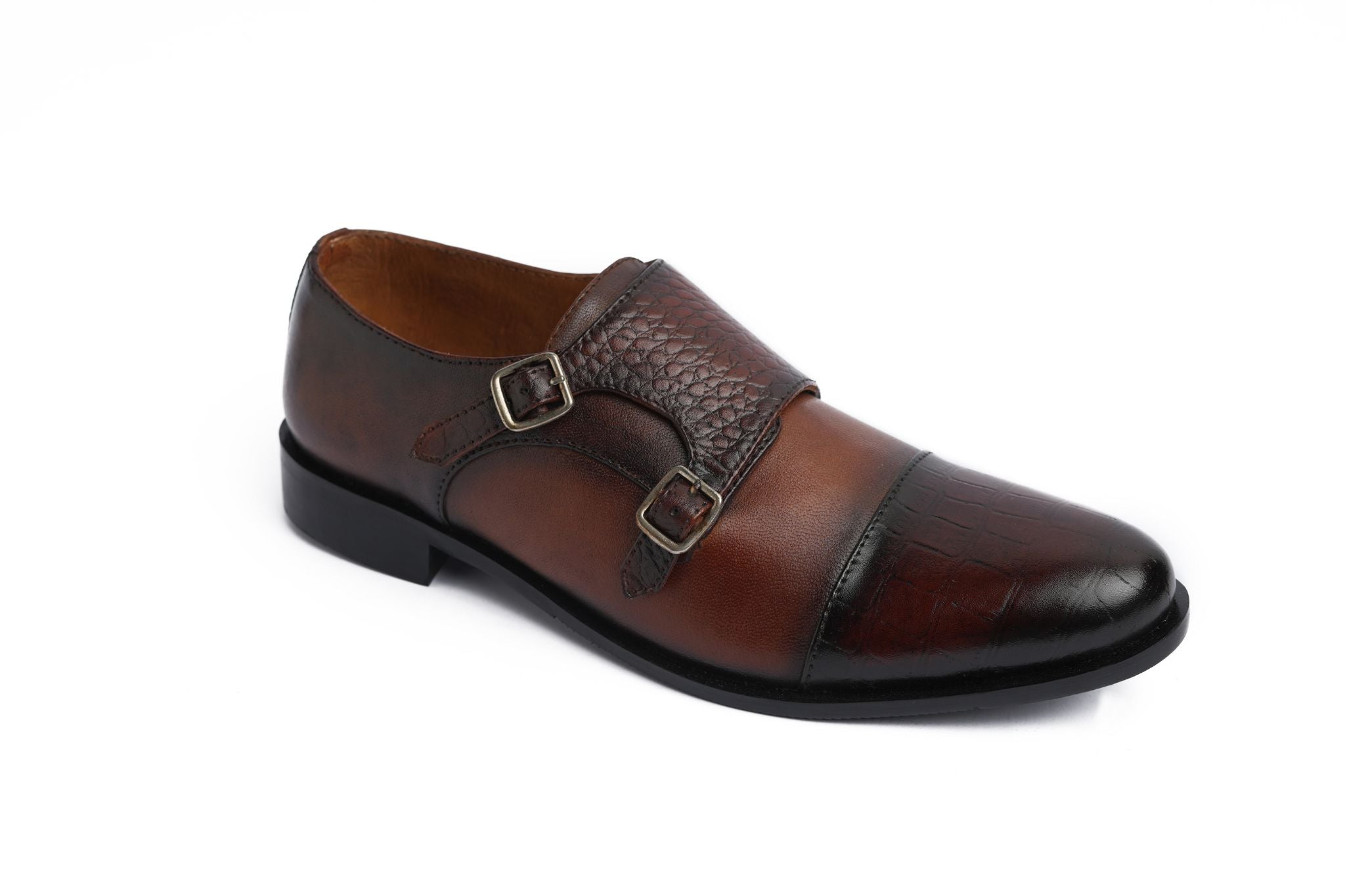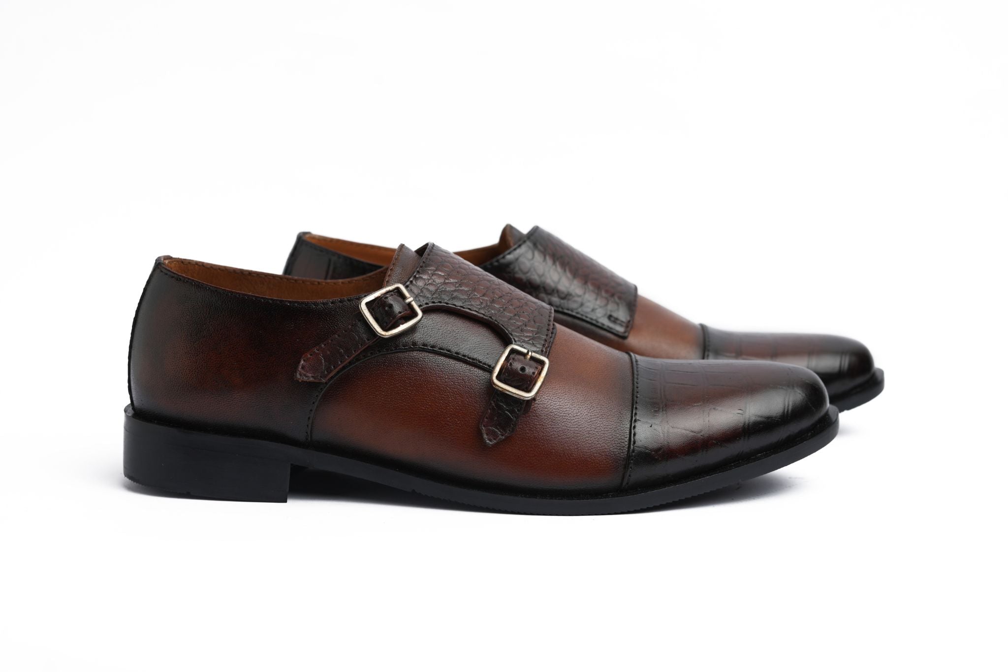A masterpiece of modern craftsmanship, this double monkstrap showcases marquetry in hand-burnished chestnut leather. Croc and pebbled inlays create a striking contrast, lending depth and individuality to its refined design.